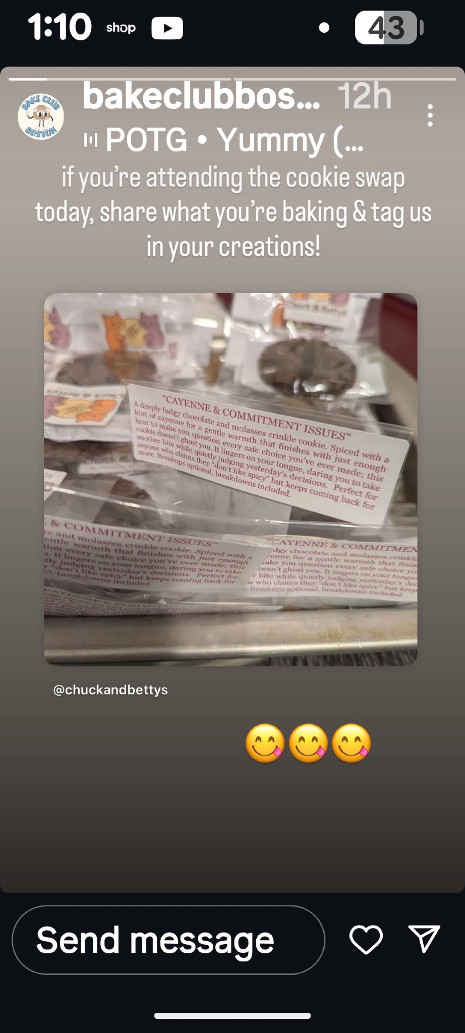 Cayenne & Commitment Issues is my signature bake — a deeply fudgy chocolate–molasses crinkle with a quiet heat of cayenne that lingers. It’s my most popular because it’s comforting but honest: familiar at first bite, then a little confrontational. People love it because it feels human — rich, balanced, and made for those who know that dessert can hold both sweetness and bite.